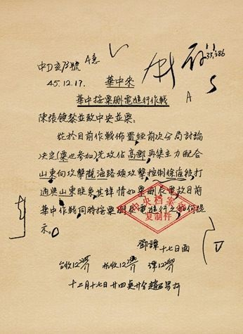 1945年12月17日,华中野战军关于同意粟裕建议进行高邮战役致中央的电文。