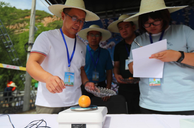 平谷区的果品专家对果子分别进行单果重和含糖量检测。最终,117.39克的一颗红杏成为“大杏王”,即单颗重量超过了二两三;含糖量18.4度的一颗红杏成为“甜杏王”。