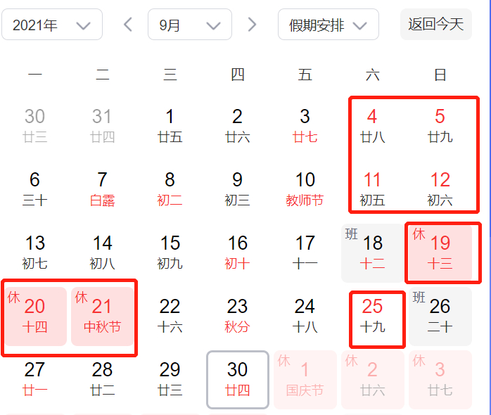 2021年9月19日至21日放假调休,共3天。9月18日(星期六)上班。