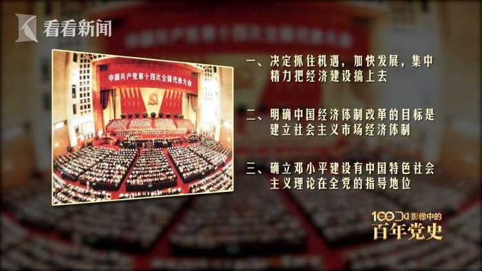 这一年10月,中共十四大作出了三项具有深远意义的决策。一,决定抓住机遇,加快发展,集中精力把经济建设搞上去;二,明确中国经济体制改革的目标是建立社会主义市场经济体制;三,确立邓小平建设有中国特色社会主义理论在全党的指导地位。