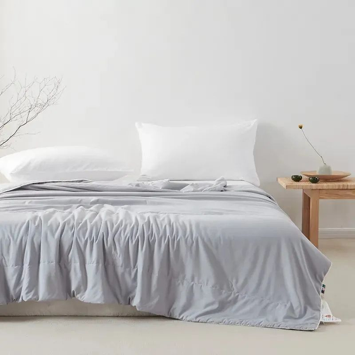 采用水洗真丝面料,摸起手感清凉柔软亲肤,整体重量也非常轻薄,睡感舒爽,无闷热感。盖着不压身,轻盈无负担。