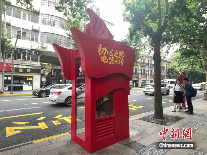 百年后的今天,在淮海中路靠近成都南路,比邻渔阳里和树德里旧址,树立起了一间全新的电话亭,以醒目的鲜红旗帜和火焰形象向百年前的英雄致敬。这间坐落在百年淮海路的红色电话亭,吸引了无数来往行人的关注,不少年轻人走进亭子,用当代青年自信的微笑在屏幕前为党打CALL,制作成个人专属明信片,而这一张张笑容也成为了生活在新上海里的年轻人向百年前先烈所表达的敬意,他们也在以当下的美好生活向前辈汇报。