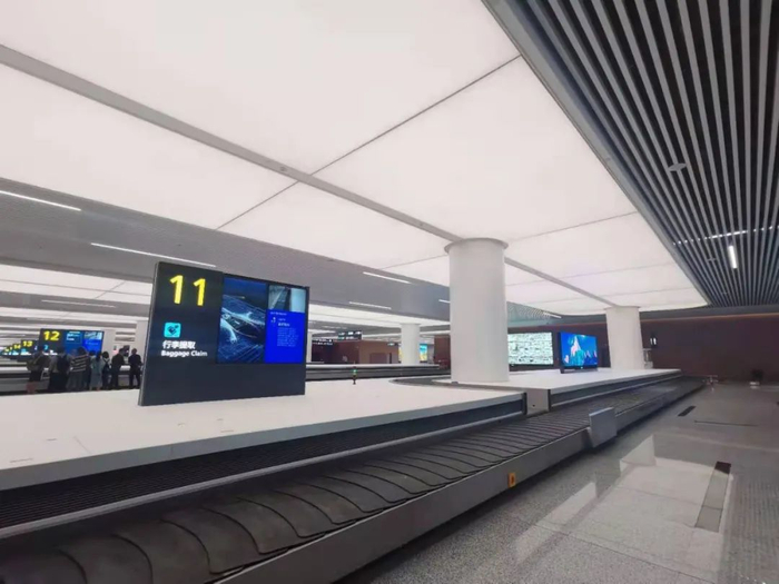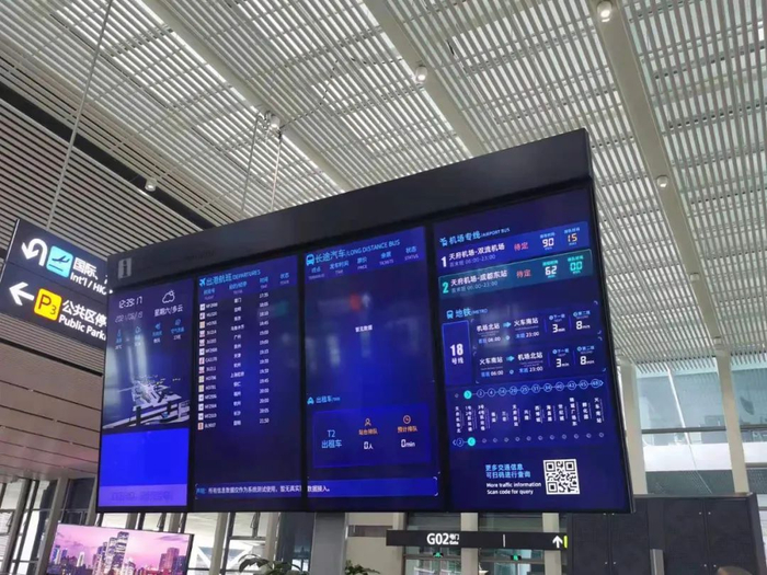 GTC内在25个关键点位设置综合交通信息显示屏。97块屏幕实时显示出港航班信息,长途汽车、机场专线票务信息,地铁乘车信息,等候出租车旅客排队情况及等待时间等,方便旅客选择最合适、最高效的交通方式。