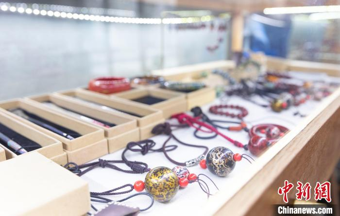 除了漆画创作,吕希勤还从事着漆器制作。在吕希勤的工作室中,陈列着茶杯、水壶、吊坠、手镯、镇纸、发簪等各式漆器,或绚丽多彩,或古朴典雅。吕希勤告诉记者,现在他在制作漆器时也会进行一些创新,使之更符合年轻人的审美。