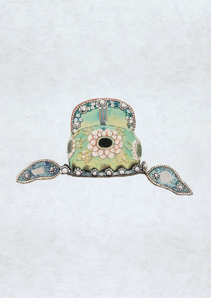 清月白色暗花绸串玻璃珠朵花纹学士盔