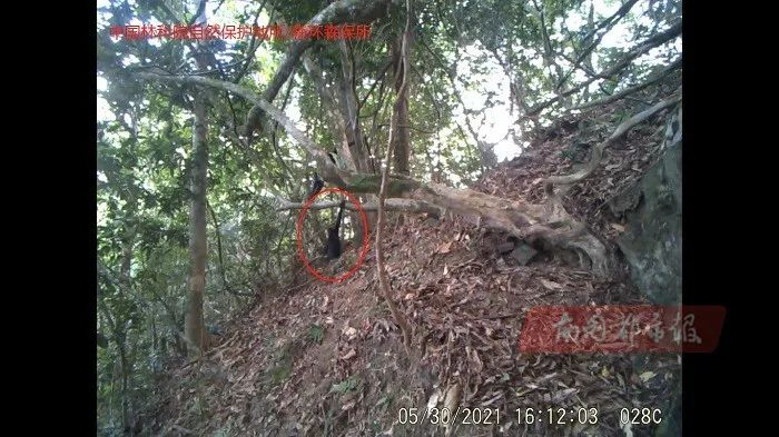 4G红外相机远程智能监测系统,在霸王岭林区拍摄到了海南长臂猿C群一只青少年个体下地活动(视频截图)