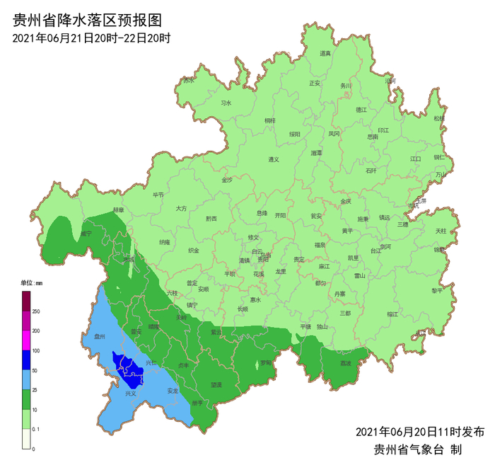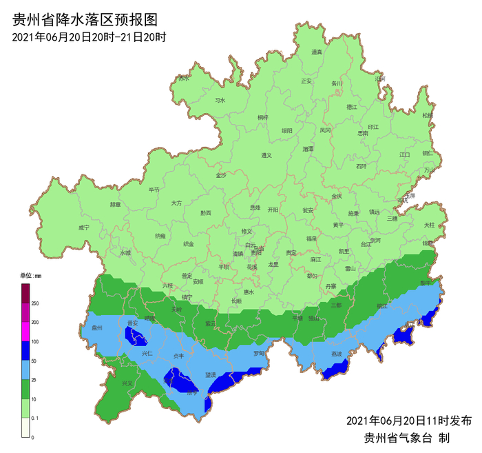 6月20日20时-6月21日20时:省的南部和东部地区有一定的地质灾害气象风险等级,其中安顺市南部、铜仁市西部、黔南州中南部及黔东南州中南部地区地质灾害气象风险等级较高,请注意防范!其余地区地质灾害气象风险等级低。