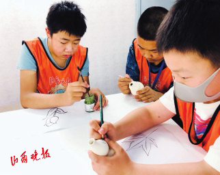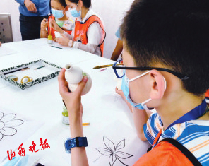 小记者们分工明确,你负责打底,我负责上色,忙得不亦乐乎。一会儿工夫,素白花瓶上出现了小花、吉祥等字样……在上色环节,果然遇到难处,珐华颜料需要先搅拌均匀,再耐心上色,这一环节着实考验了小记者们的耐力。一位小记者感慨:“今天我们不仅亲眼看到山西三宝之一的珐华器,更在制作过程中感受到了工匠们的不易,收获很多啊!”活动结束,小记者们纷纷拿着自己涂好色的作品合影留念。
