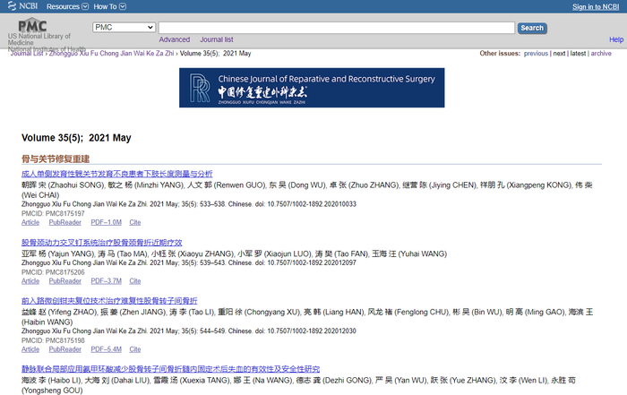 《中国修复重建外科杂志》为PMC数据库完全收录期刊(Full Participation),标志杂志出刊后整期全文会即时在PMC上线(https://www.ncbi.nlm.nih.gov/pmc/journals/4037/),全球读者可免费下载阅读,同时还实现了期刊官网(http://www.rrsurg.com)与PMC数据库平台互连,这对提升杂志国际传播和国际影响力具有重大意义。目前PMC已上线本刊2020年以后出版的所有论文,过刊将回溯至2017年,数据正在逐步完善中。