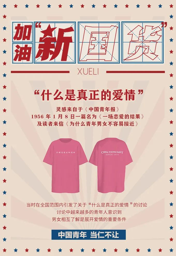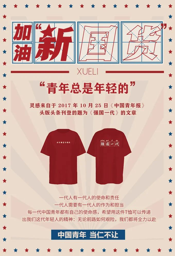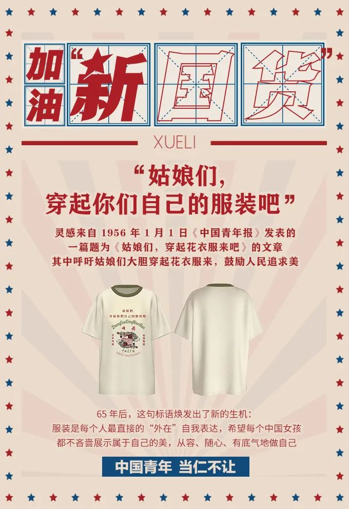 其中,XUELI 女装和《中国青年报》合作,推出四款「国潮」T恤: