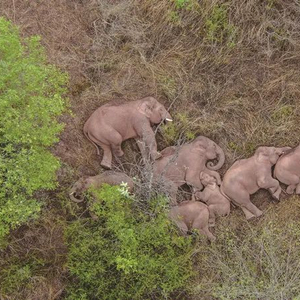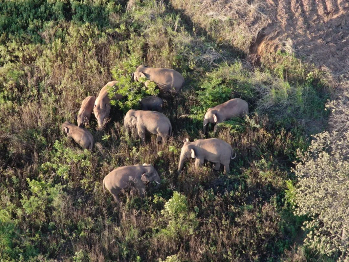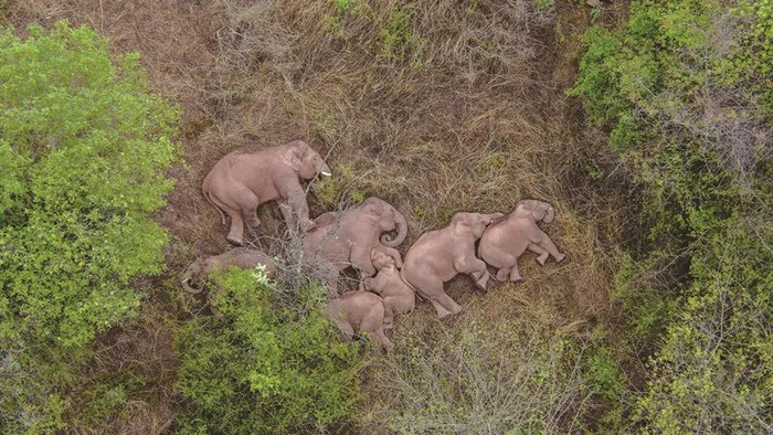 6月7日,象群在晋宁区夕阳乡休息(无人机照片) 新华社 图