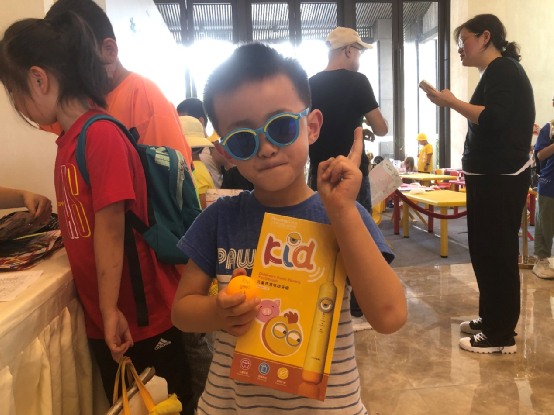 “耶!拍立得!”交完作品的来到抽奖台的小朋友乐乐从抽奖箱内抽出了一个写着“一等奖”的乒乓球,高兴得手舞足蹈起来,身旁的小朋友向他投来羡慕的眼光,他在人群中举着奖品比了一个“耶”。