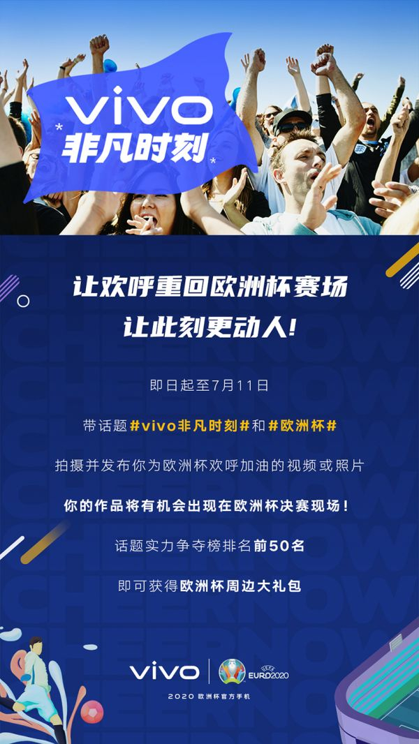 如果感觉单纯观赏不过瘾,vivo又为球迷提供了诸多参与互动的机会。比如“vivo非凡时刻”活动,只要带话题#vivo非凡时刻#和#欧洲杯#拍摄并发布自己为欧洲杯欢呼加油的视频或照片,作品就有机会出现在欧洲杯决赛现场。话题争夺前50名,还可以获得欧洲杯周边大礼包。
