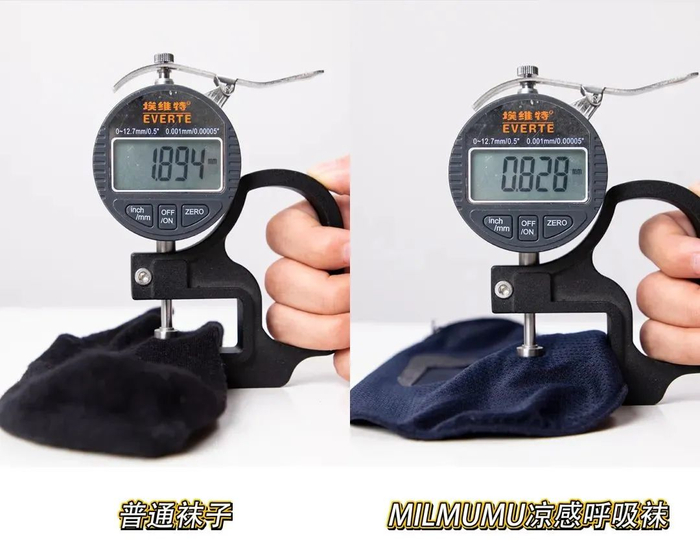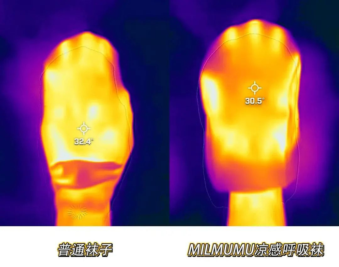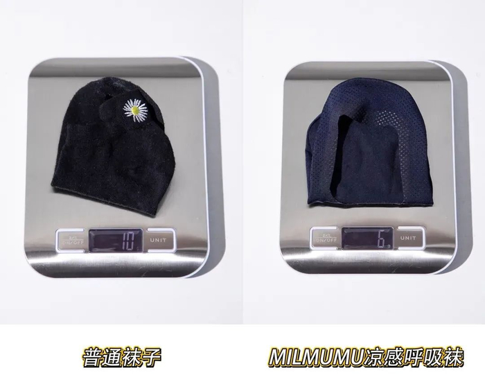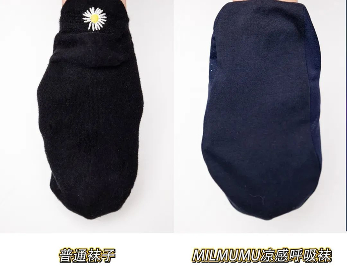 我们将MILMUMU凉感呼吸船袜和普通袜子进行对比可以发现,同样将手放进袜子里,船袜的散热性明显更好。