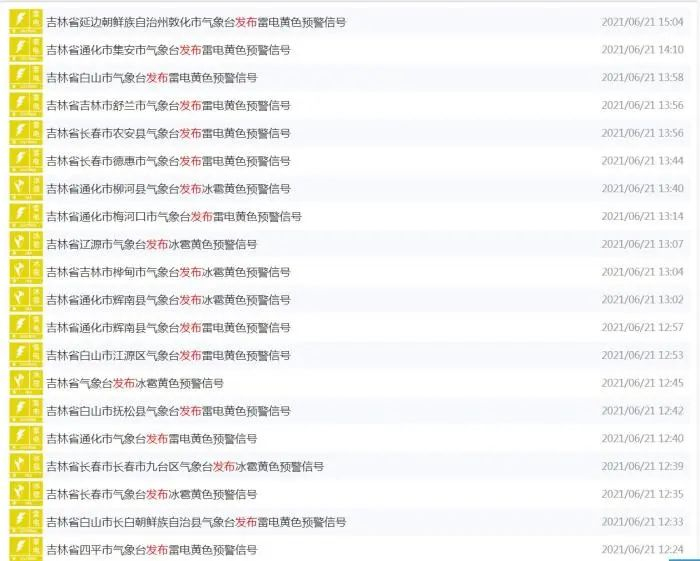 截至21日15时,吉林省已连发44个雷电、冰雹、暴雨气象灾害警报与预警信号。