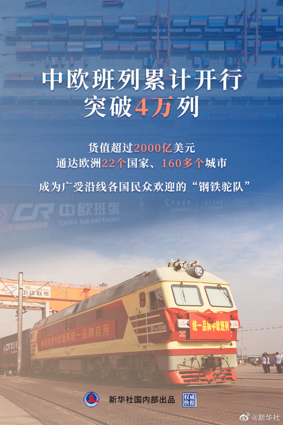 截至目前,中欧班列累计开行突破4万列,合计货值超过2000亿美元,打通了73条运行线路,通达欧洲22个国家160多个城市。新冠肺炎疫情发生以来,中欧班列累计向欧洲发运1199万件防疫物资。2016年6月20日,统一品牌中欧班列首达欧洲(波兰)仪式在波兰华沙举行。