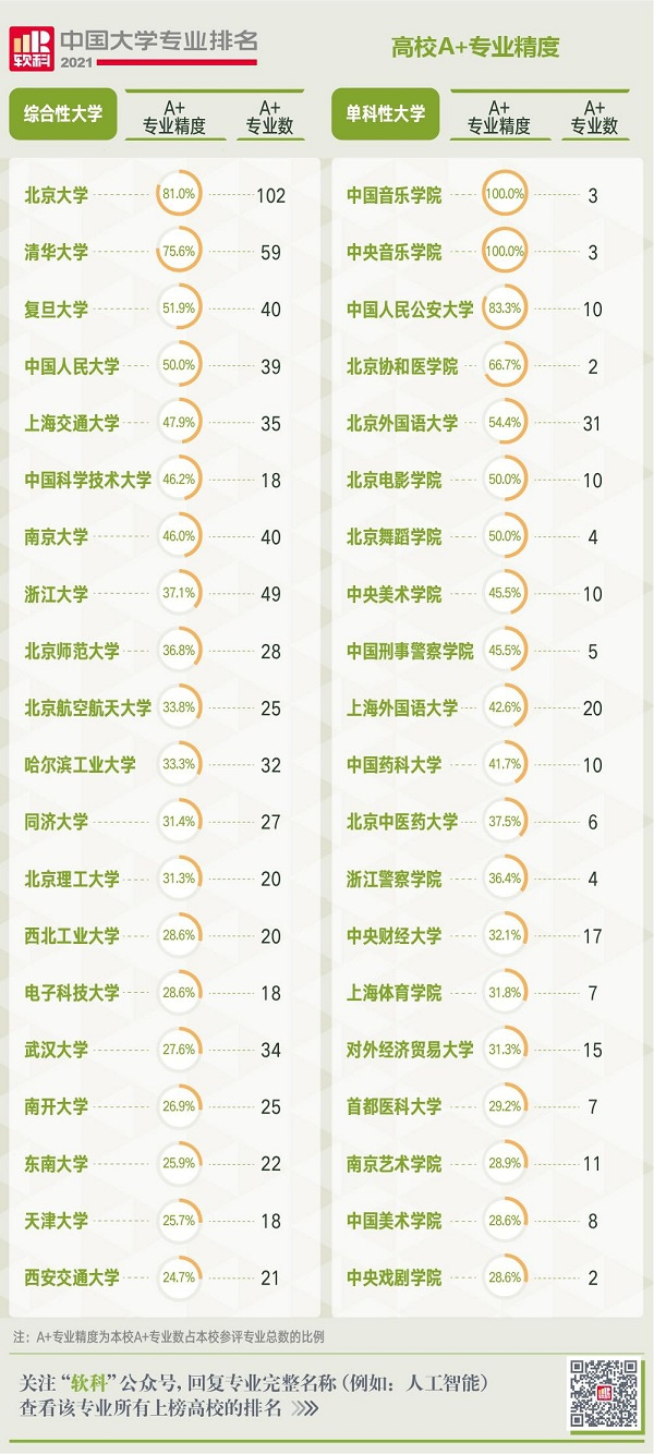 综合性大学中,北京大学和清华大学分别以81.0%和75.6%的A+专业精度位列综合性大学冠亚军,其他A+专业精度位列综合性大学前十强的依次为复旦大学(51.9%)、中国人民大学(50.0%)、上海交通大学(47.9%)、中国科学技术大学(46.2%)、南京大学(46.0%)、浙江大学(37.1%)、北京师范大学(36.8%)、北京航空航天大学(33.8%)。