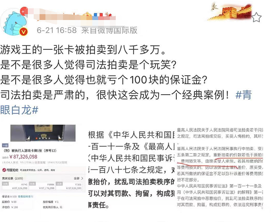 近日,安徽滁州中院在阿里拍卖上,公开拍卖一涉刑案财物,其中一款标明为“游戏王青眼白龙金卡”的卡牌,成为近几年来网络拍卖平台上最火的一拍。