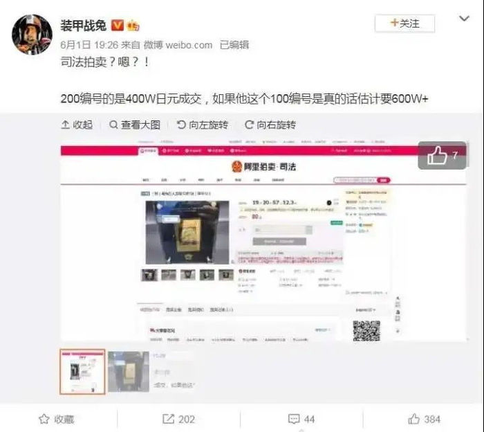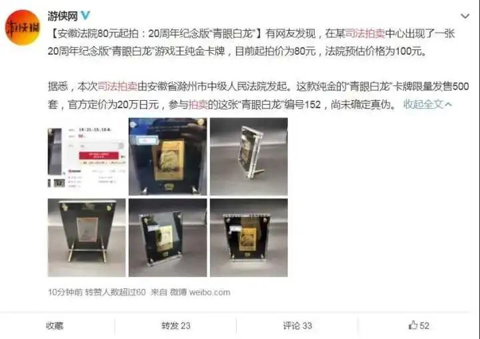 这张卡牌法院送拍标价80元起。宅圈玩家奔走相告,限量版,纯金的,全球只有500套,官方定价1万多,吸引了网友围观。