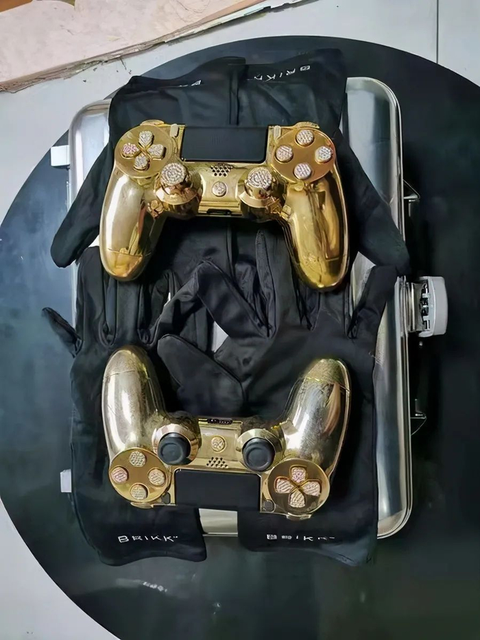 小小的金属箱,开箱即见镀金镶钻游戏手柄。有网友说这是《战神》限定款PS4,五亿限定版PS4。还有若干游戏机。