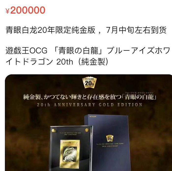 据封面新闻,这是一张20周年纪念版“青眼白龙”游戏王纯金卡牌,用料为约11g的24K金,限量发售500件,商品上会印有“No.1——500”的收藏编号,属于集换式卡牌中的王者级藏品,官方定价为20万日元(约合1.2万人民币)。