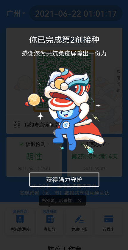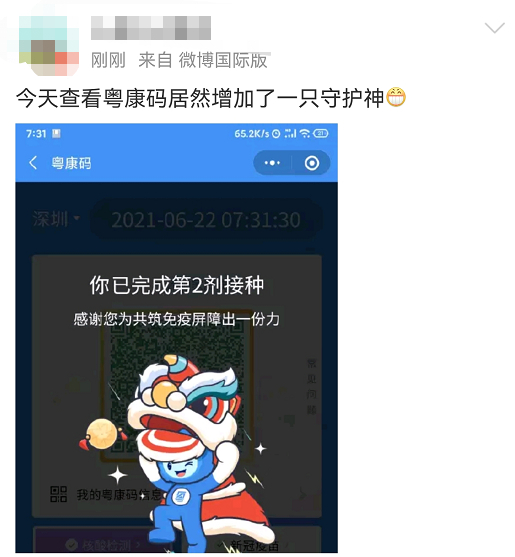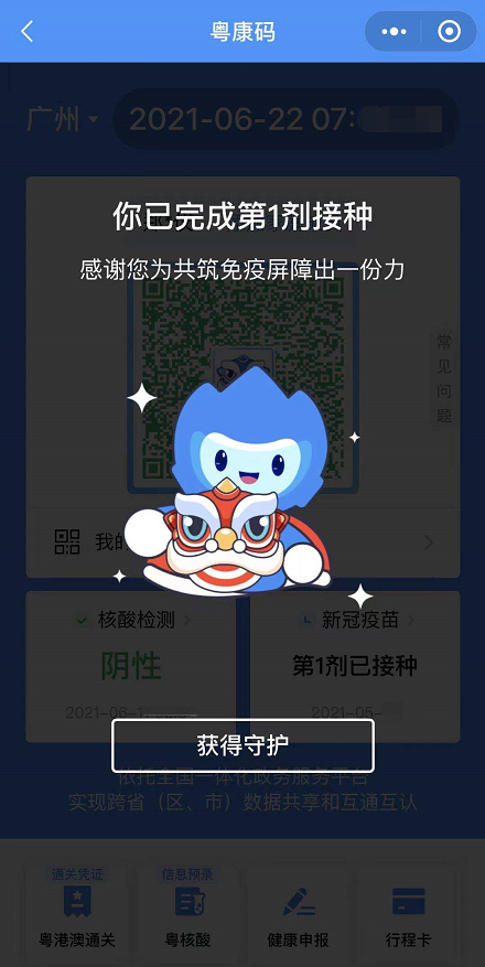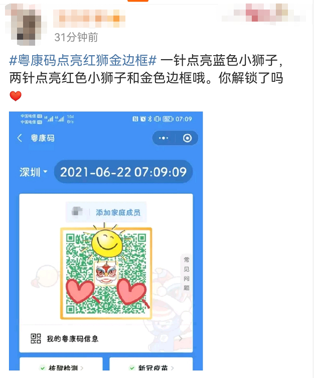 “粤康码”中间将显示一只蓝色小狮子头像,