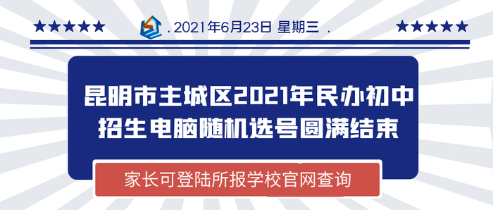 备受关注的昆明市主城区2021年民办初中招生电脑随机选号工作已于今天(6月23日)上午圆满完成,选号结果将由各学校于23日下午公布,各位家长可到所报学校网站查询,并按学校要求办理相关手续。