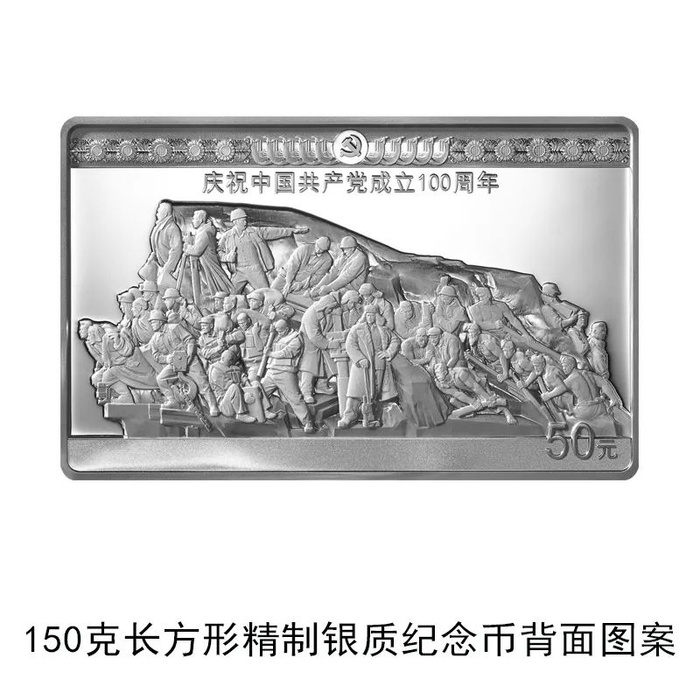 150克长方形银质纪念币背面图案为《攻坚》雕塑局部造型,辅以中国共产党历史展览馆馆徽等组合设计,并刊“庆祝中国共产党成立100周年”字样及面额。