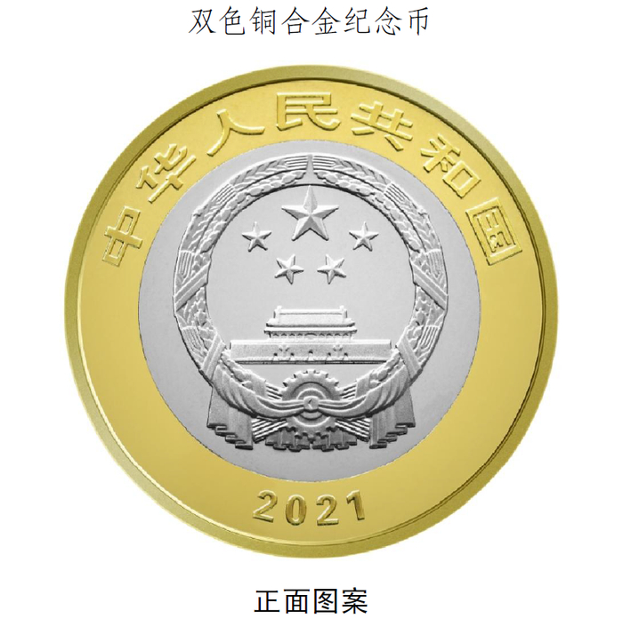 双色铜合金纪念币正面图案为中华人民共和国国徽,国徽上方刊“中华人民共和国”国名,下方刊年号“2021”字样。