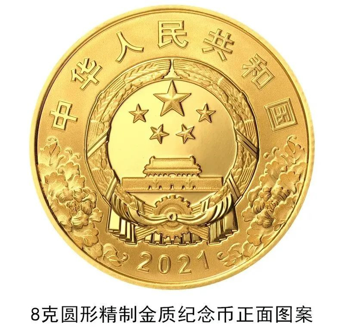 8克圆形金质纪念币背面图案为党徽、上海中共一大会址、浙江嘉兴南湖红船、天安门、礼花、牡丹花、飘带等组合设计,并刊“庆祝中国共产党成立100周年”字样及面额。