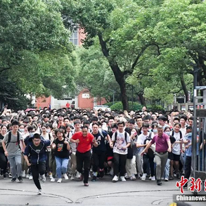 资料图:6月9日,考生与老师一同冲出长沙市一中考点。 中新社记者 杨华峰 摄