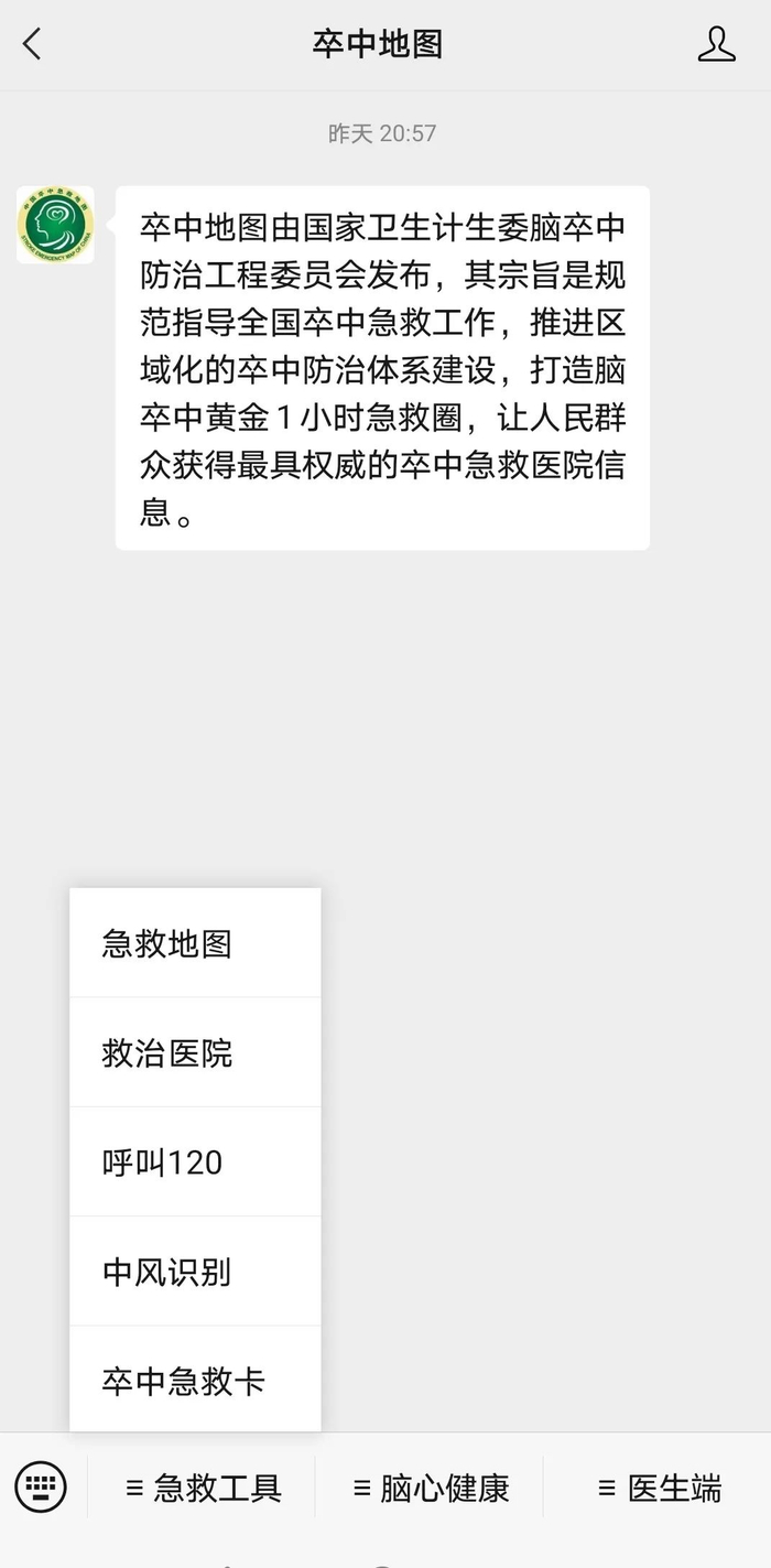 可通过“卒中地图”微信公众号或小程序,查询到“西安市脑卒中急救地图”,和就近医院取得联系。