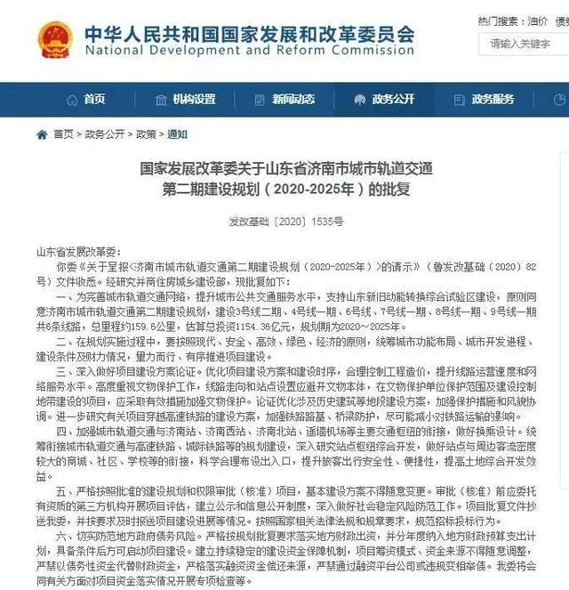 2020年,济南轨道交通第二期建设规划获得国家发改委批复,其中包括建设3号线二期、4号线一期、6号线、7号线一期、8号线一期、9号线一期共6条线路,总里程约159.6公里,估算总投资1154.36亿元,规划期为2020~2025年。