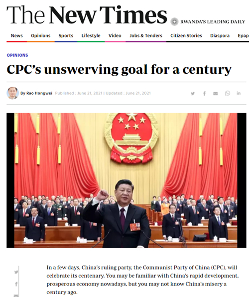 原标题:驻卢旺达大使就建党百年在卢主流媒体发表署名文章