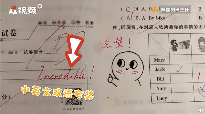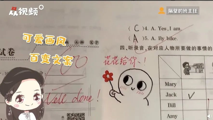 河南洛阳一位90后小学英语老师在学生的满分试卷上,画了可爱的表情包作为鼓励,这样的惊喜萌萌哒!