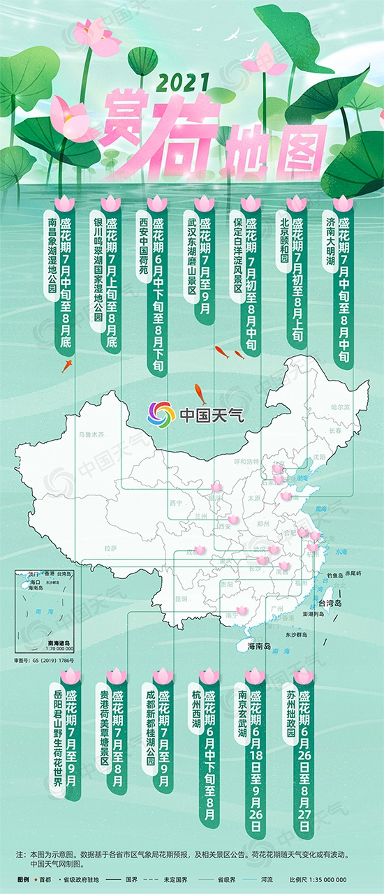 中国天气网讯 要说夏日花卉的C位,大家应该都会想起“出淤泥而不染”的荷花,每逢夏日,赏荷便到了最好的时节。盛夏时节,湖泊荷塘莲叶田田、花开正好,在池边河畔泛舟赏荷好不惬意。如果你正在困惑最美荷花要去哪儿赏,何时可赏,就来看中国天气网特别推出的全国赏荷地图吧,给你最全的赏荷攻略。