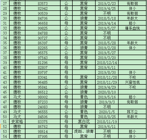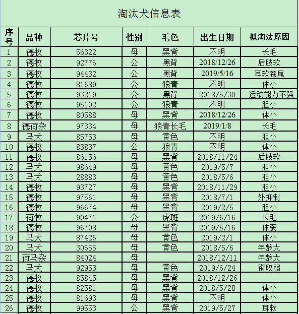 公告附件中的淘汰犬信息表显示,此次出售的淘汰犬共54只,有德牧、德荷杂、马犬、荷牧、荷马杂、史宾格六种品种,信息表详细展示了每只淘汰犬的性别、毛色,部分列明了淘汰犬的出生日期,还载明了每只淘汰犬的淘汰原因,如运动能力不强、胆小、体小、年龄大、兴奋性低、衔取弱、后肢软等。