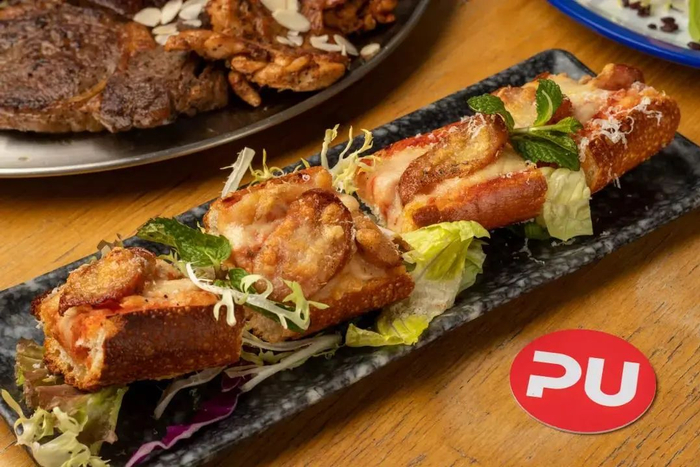 煎至八成熟的牛扒,一口咬下去,外焦里嫩,肉汁满满!再淋上特调的酱汁,浓汁香味充斥在嘴里~板凳披萨焦香的外皮,软绵绵的内里,每块披萨都铺满配菜,和披萨底一起放入口中,美味可口!
