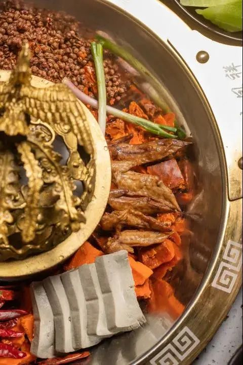 要看火锅正不正宗,看锅底就知道。外圈是牛油辣锅,十多种食材搭配在一起,鸡翅尖、鸭心....简直不要太吸引人!倒入特色的茶作为汤底的生命源泉,处处的细节都是好评!