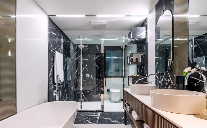 每一个户型都是根据空间特点单独设计,包括用材,例如墙板的颜色、石材的纹理、底板的木纹等,都是精心挑选;不仅用材,在施工技艺上也是如此。