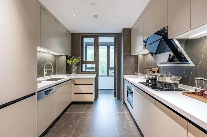 每个户型的厨房,台板都是单独设计,并且一体成型,没有接缝。