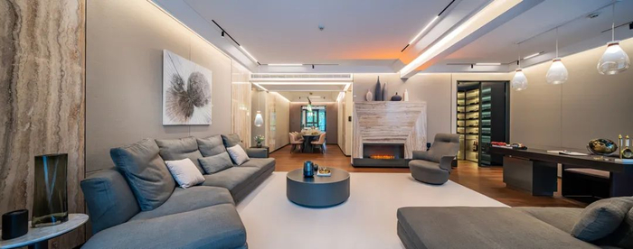 在用材用料、色调搭配,包括户型的格局也秉持了高标准和灵动感,例如:BV皮革编制的玄关设计,带来与众不同的高级感,体现高端生活空间的品质和格调。选取意大利更亲近自然的四块整版的洞石上墙,虽然造价非常高,但没有抛光打磨石板却自然呈现出非常好的光泽感,纹理和洞孔接近木化石的感觉;又如全屋通铺的高温碳化地板,是依据东北干燥和冬季使用地热的具体条件而设计,不但不易变形,而且具有耐用,划痕可修复的优点,此外还具有良好的亲肤感,孩童赤脚玩耍时会有很好的体验。几乎每一位来访的客人,都对这种地板赞不绝口。