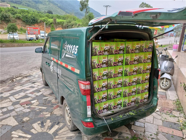 跟着工人们采摘三华李的节奏,不出十分钟,记者就看到停在林子边运输果子的三轮车就已经满满当当,往山下的打包网点运去。在山下的打包网点,工人们正忙活着将刚摘下来的新鲜三华李选品、打包,精选过后的三华李被装进了印有“八步三华李”的精品包装盒,一辆中国邮政的车辆开进来把它们打包上车,不久这些新鲜的果子就会到达广东、湖南等地的买家手里。