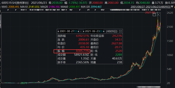 而贵州茅台的股票自2001年上市,20年来,最高涨幅超过8305%。