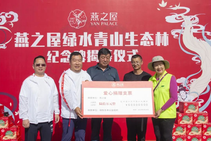 易妈妈在公益植树这条路,已经走了20多年,完成植树800万棵,绿化沙漠戈壁3500亩,植树成活率达到85%~90%,易妈妈的“绿色生命”旗帜从未褪色。接过易妈妈的“绿色生命”接力棒,燕之屋总裁李有泉代表该公司向NPO绿色生命环保公益组织捐款人民币60万元,以实际行动支持环保公益事业。