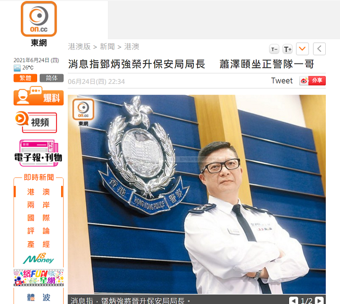 [环球网报道]据香港“东网”刚刚消息,香港警队“一哥”、现任警务处处长邓炳强将接替李家超保安局局长一职。