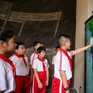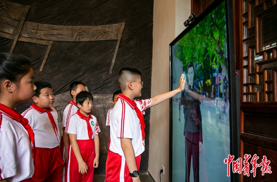 6月24日,贵州省荔波县邓恩铭烈士故居,荔波县第一小学的同学们与“时光之镜”中的“邓恩铭”互动。中青报·中青网记者 曲俊燕/摄