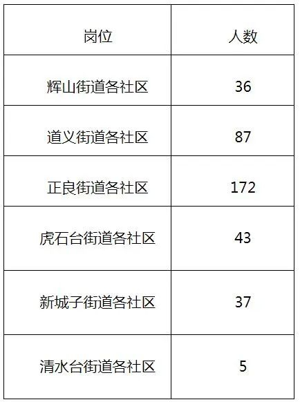 | 序号 | 街道 | 面向社会招录人数 | 定向招录退役士兵人数 | 总计 |