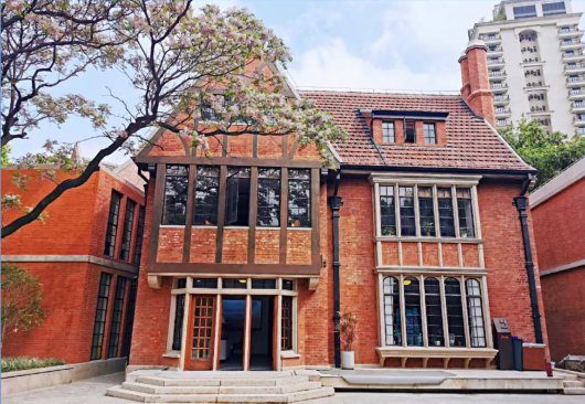 “66梧桐院·邻里汇”主楼建筑由匈牙利著名建筑设计师邬达克设计,原为国际礼拜堂牧师住所,属英国乡村风格花园住宅,假三层(局部二层)砖木结构,最明显的立面特征是山墙的半露木构架、清水红砖墙面及陡峭的红色瓦屋顶,属于徐汇区文物保护建筑。