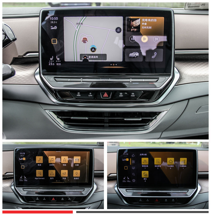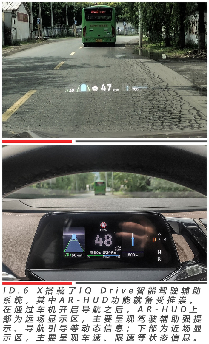 在实际试驾体验中,ID.6 X的AR-HUD亮度比ID.4 X有明显的提升,信息显示看上去更为清晰。另外,导航引导中AR动态信息仅在左右转弯时有所体现,在经过异形路口、环岛时没有任何指向显示,仍需要看中控屏的导航画面,由此看来AR-HUD功能的实用性还需提升。